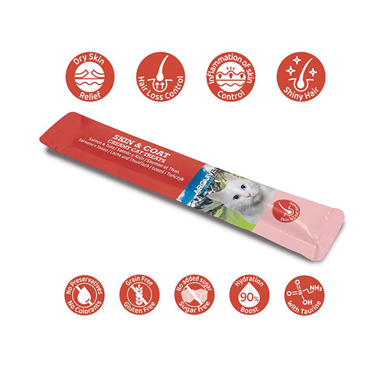 Um lanche em forma de purê cremoso, projetado para ajudar a controlar a pele e a pele. Graças à sua fórmula com salmão (43,95%), atum (30,48%), óleo de peixe rico em DHA e EPA, bem como ácidos graxos insaturados ômega 3, ajuda a controlar a queda de cabelo, reduzir a inflamação da pele, aliviar a pele seca e ter um cabelo brilhante.